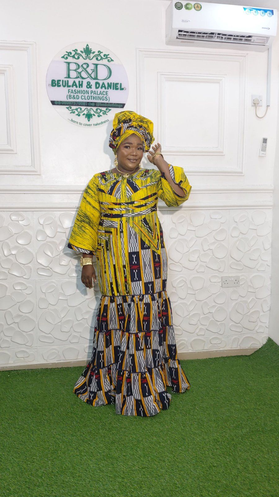 Embrace the perfect blend of tradition and contemporary flair. This stunning maxi dress from Beulah & Daniel Fashion Palace is designed for the woman who isn't afraid to stand out. Featuring a vibrant yellow palette paired with intricate geometric motifs, this piece offers a regal silhouette that transitions seamlessly from a high-profile event to an elegant brunch. Key Features: Flattering tiered skirt, structured sleeves, and a matching headwrap for the complete African Queen aesthetic. Fabric: Premium quality 100% Ankara cotton. Occasion: Weddings, church services, or gala nights. Shop the look today and be born to cover nakedness with style.