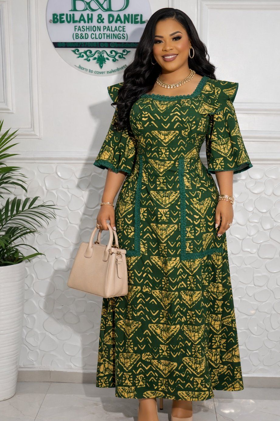 Step into effortless elegance with our beautifully crafted Ankara maxi dress, designed for the modern woman who values style, comfort, and cultural richness. Made from premium-quality Ankara fabric, this dress features a striking green and gold pattern that exudes sophistication and bold femininity. Designed with a flattering fitted bodice and a graceful flowing maxi length, this dress enhances your silhouette while offering ease of movement. The stylish flared sleeves and delicate trim detailing add a refined touch, making it perfect for both everyday elegance and special occasions. Fully lined for added comfort and structure, this dress ensures a smooth fit, durability, and confidence with every wear—no transparency, just pure luxury. Key Features: Premium Ankara fabric with vibrant, long-lasting print Fully lined for comfort, coverage, and durability Flattering fitted waist with a flowy maxi silhouette Elegant flared sleeves with detailed finishing Breathable and comfortable for all-day wear Suitable for casual outings, church, and special events Style Tip: Pair with nude heels and a structured handbag for a clean, sophisticated finish.