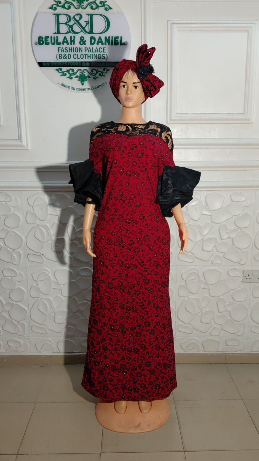 Turn heads with this stunning red and black statement dress, designed for the confident and sophisticated woman. Crafted from richly patterned fabric, this piece features a flattering fitted silhouette that beautifully enhances your natural curves while maintaining comfort and ease. The upper bodice is elevated with delicate black lace detailing, adding a touch of sheer elegance and femininity. Dramatic layered organza sleeves create a bold, fashion-forward look, making this dress perfect for special occasions, celebrations, and standout appearances. Paired with a matching headwrap, this outfit embodies timeless African elegance with a modern twist. Key Features: Premium textured fabric with intricate patterns Elegant black lace neckline for a refined finish Statement layered organza sleeves Flattering, figure-enhancing silhouette Comes with matching headwrap (gele) Perfect for weddings, parties, and special occasions Step into elegance and make a lasting impression with this beautifully crafted piece from B&D Clothings.