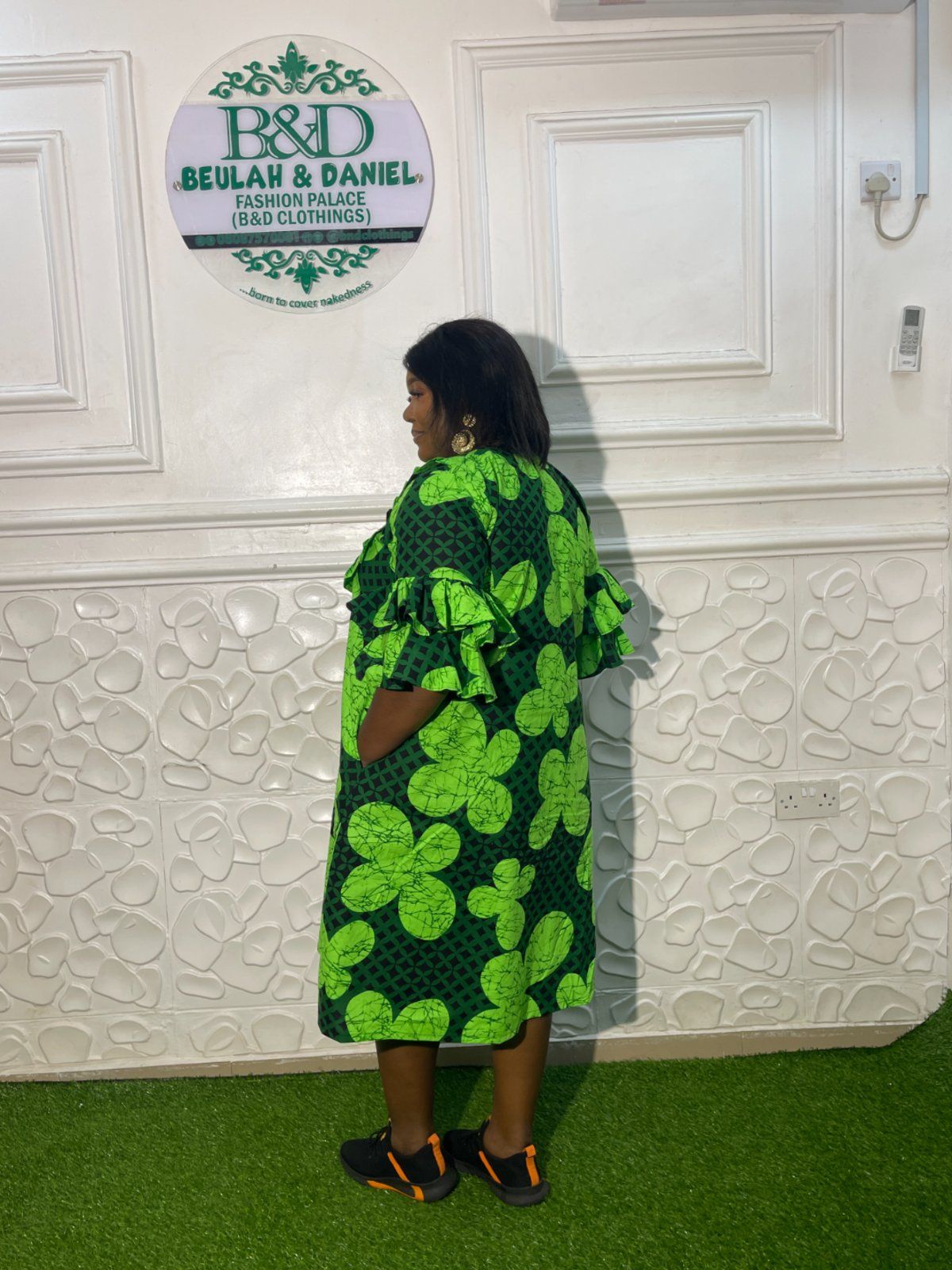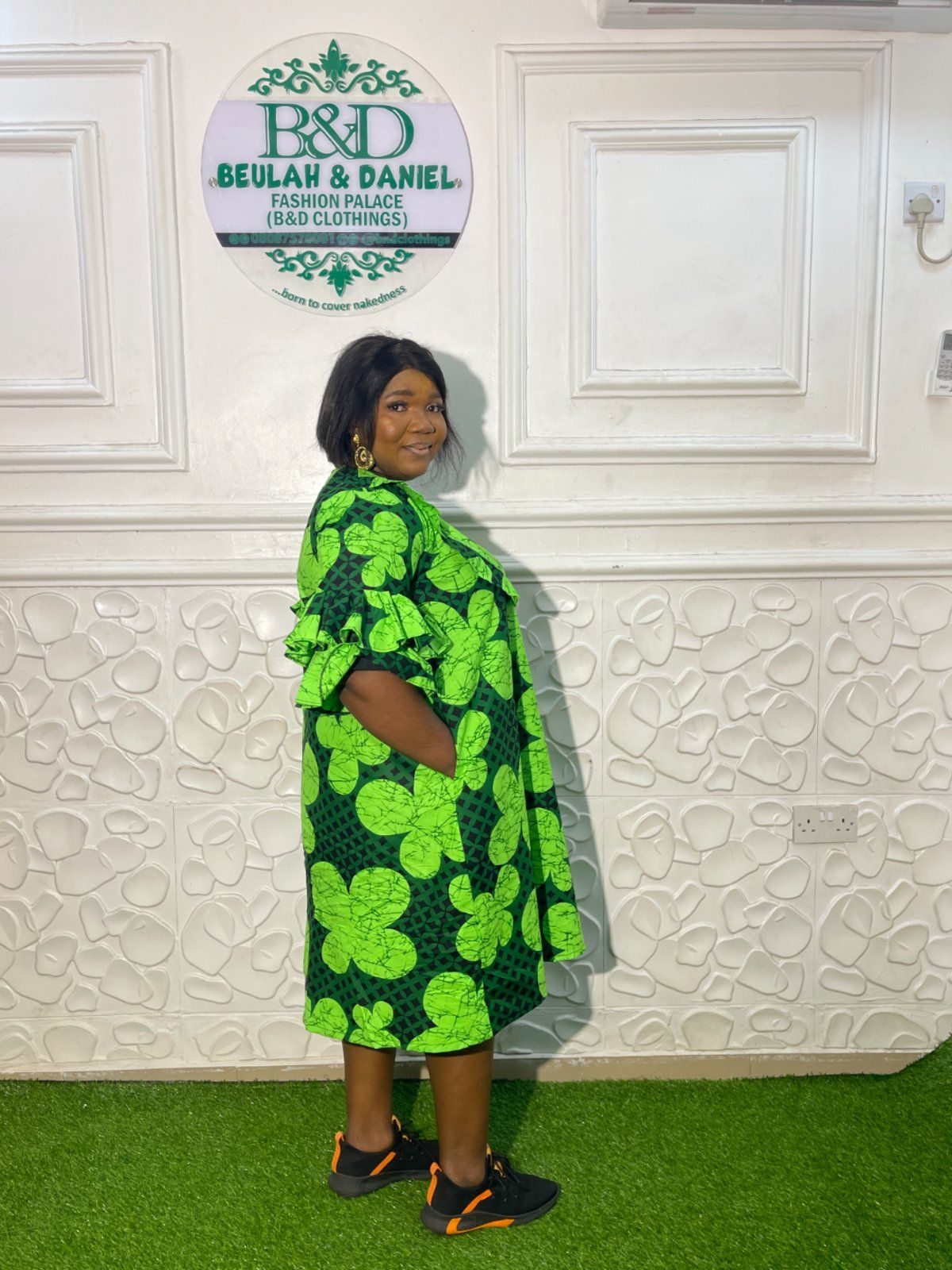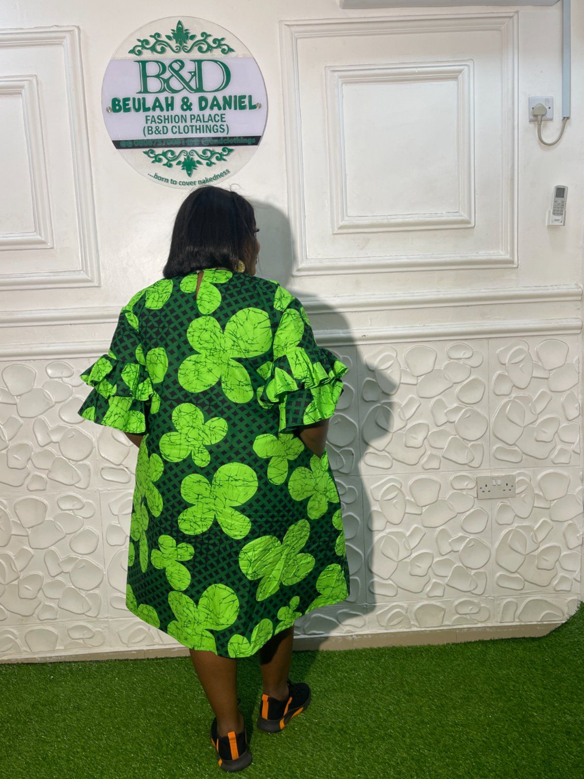 "Elevate your wardrobe with a touch of nature-inspired elegance. Our latest creation features a striking lime and forest green Ankara print that commands attention the moment you walk into the room. Why you’ll love it: Voluminous Ruffle Sleeves: Adding just the right amount of drama and flair. Flattering A-Line Silhouette: Designed for comfort without sacrificing style. Versatile Styling: Pair it with sneakers for a chic "brunch with the girls" look, or elevate it with strappy heels for a wedding guest vibe."