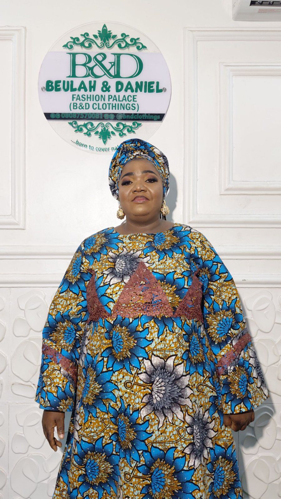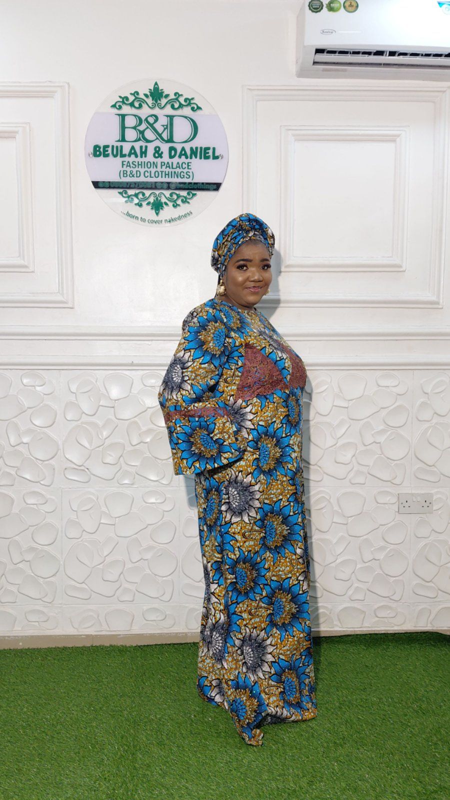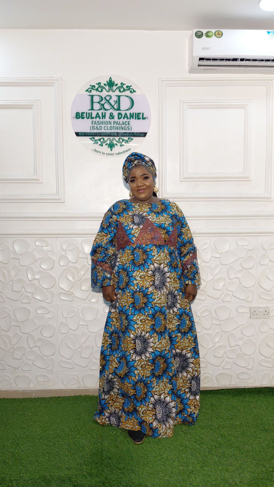 "Step into the room with confidence and grace. Our latest creation from Beulah & Daniel Fashion Palace blends traditional African heritage with high-fashion luxury. This isn't just a dress; it’s a statement of sophistication. Design Details Fabric: Premium high-quality Ankara print featuring a bold, celestial floral motif in vibrant blue, golden ochre, and crisp white. The Silhouette: A flowing, full-length maxi cut designed to provide a majestic presence while offering maximum comfort. Statement Sleeves: Dramatic, wide-flare bell sleeves lined with a contrasting dark interior for a touch of modern mystery. Artisanal Embellishments: The bodice is meticulously hand-detailed with shimmering rhinestones and intricate lace patchwork, catching the light with every movement. Crown Your Look: Includes a matching, expertly crafted headwrap (gele) to complete the traditional royal aesthetic. Why You’ll Love It "Born to cover nakedness, designed to reveal your inner queen." Whether you are attending a wedding, a gala, or a high-profile celebration, this dress ensures you are the center of attention. The structured yet breathable fabric makes it perfect for long events, while the rhinestone embellishments add that essential "wow" factor."