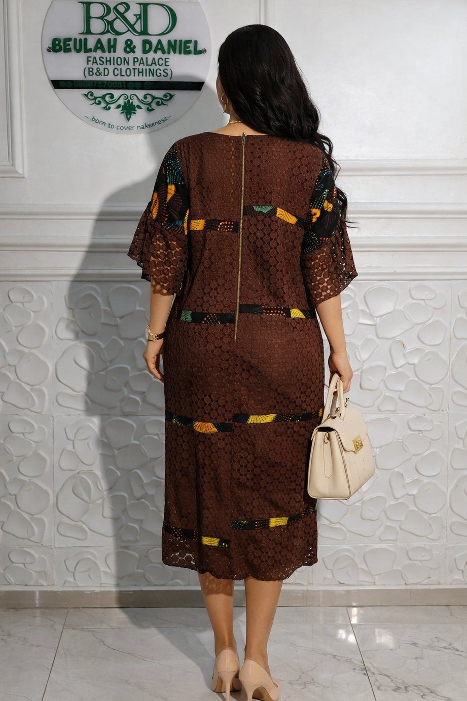 "Step into effortless elegance with this beautifully tailored cocoa-toned Ankara dress, designed for the modern woman who values comfort and style. Crafted from premium textured fabric, this piece features subtle vibrant Ankara accents that add a unique cultural touch to its rich, earthy base. The relaxed silhouette is complemented by soft, flared sleeves and a modest round neckline, offering both sophistication and ease of movement. Functional side pockets add a practical yet stylish detail, making it perfect for both casual outings and semi-formal occasions. Paired effortlessly with nude heels and a structured handbag, this dress is a timeless wardrobe essential that transitions seamlessly from day to evening. Key Features: Rich cocoa brown textured fabric Subtle Ankara print detailing for a bold accent Comfortable, relaxed fit Flared mid-length sleeves Functional side pockets Midi length for a classy finish Perfect for: Brunch dates, office wear, casual events, and elegant everyday style."