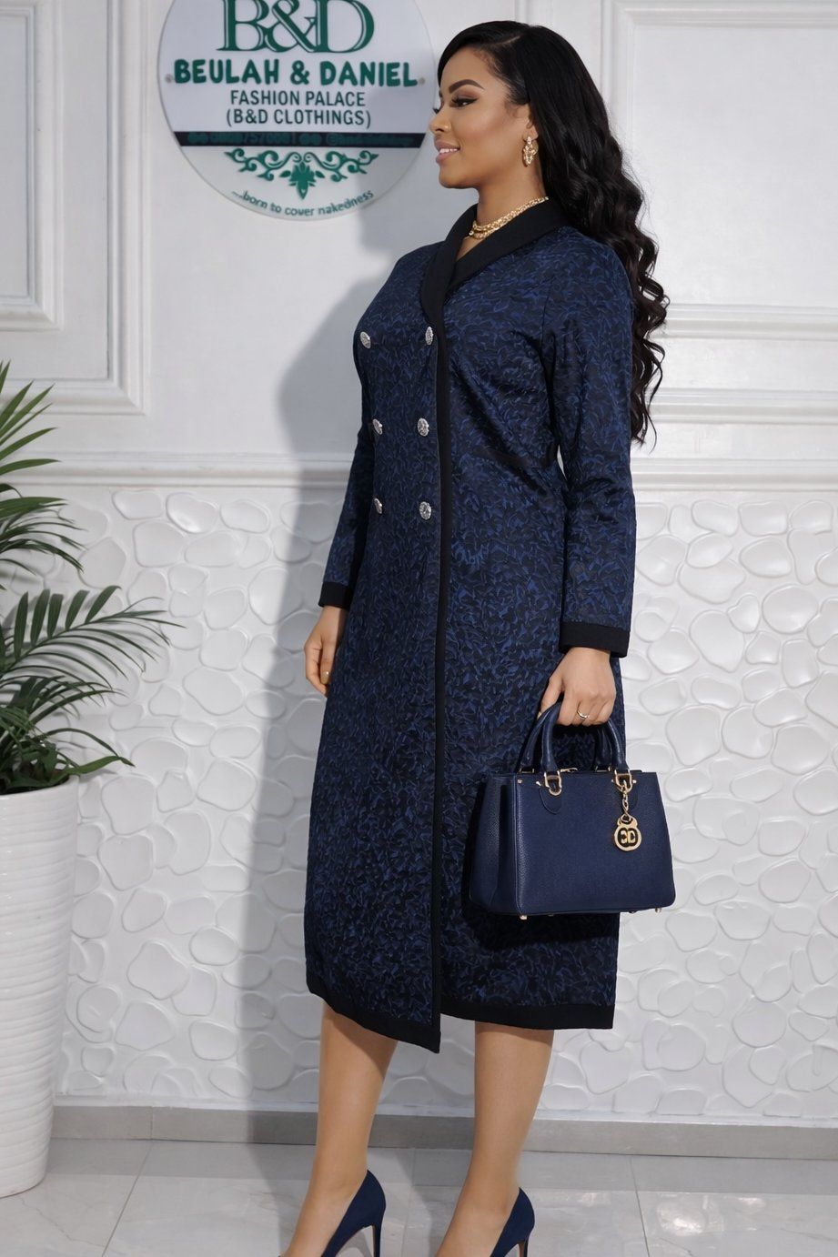 "impeccably tailored navy blue corporate dress, designed for the modern, confident woman. Crafted from premium textured fabric, this piece features a sleek, structured silhouette that flatters the figure while maintaining a professional edge. The double-breasted button detailing adds a touch of classic elegance, while the contrasting black lapel and trim elevate the overall design with a sharp, polished finish. Long sleeves and a modest knee-length cut make it perfect for office wear, business meetings, or formal engagements. Paired effortlessly with matching navy accessories, this dress embodies power, grace, and timeless style. Key Features: Rich navy blue textured fabric Double-breasted front with statement buttons Contrasting black lapel and trim Tailored fit for a flattering silhouette Knee-length, suitable for corporate and formal settings Fully lined for comfort and structure Style Tip: Complete the look with navy heels and a structured handbag for a bold, confident statement."