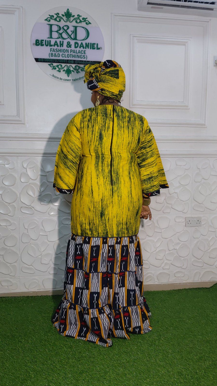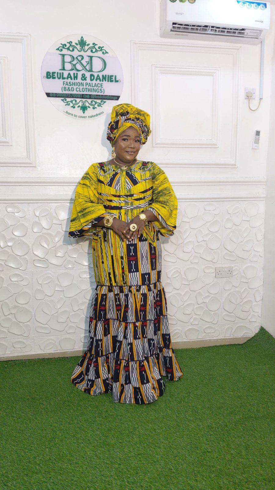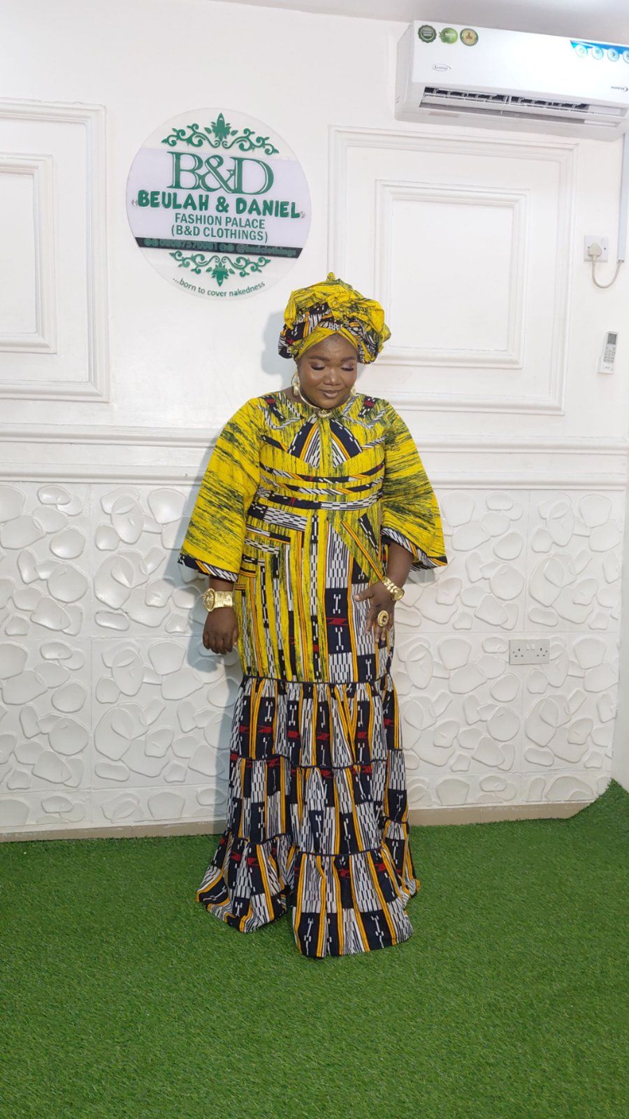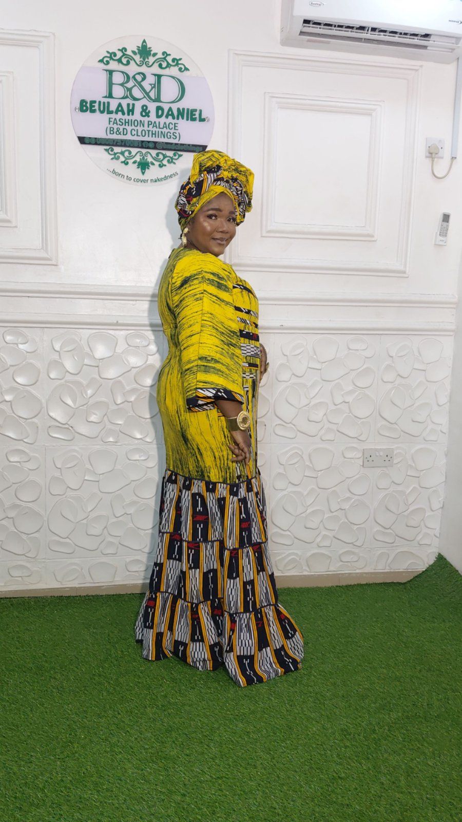 "Embrace the perfect blend of tradition and contemporary flair. This stunning maxi dress from Beulah & Daniel Fashion Palace is designed for the woman who isn't afraid to stand out. Featuring a vibrant yellow palette paired with intricate geometric motifs, this piece offers a regal silhouette that transitions seamlessly from a high-profile event to an elegant brunch. Key Features: Flattering tiered skirt, structured sleeves, and a matching headwrap for the complete African Queen aesthetic. Fabric: Premium quality 100% Ankara cotton. Occasion: Weddings, church services, or gala nights. Shop the look today and be born to cover nakedness with style."