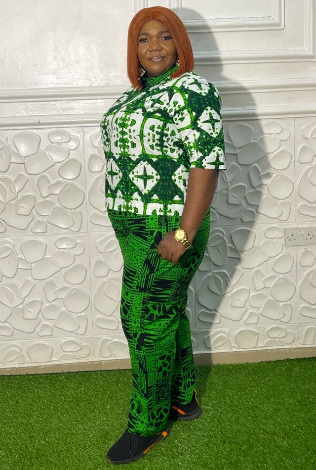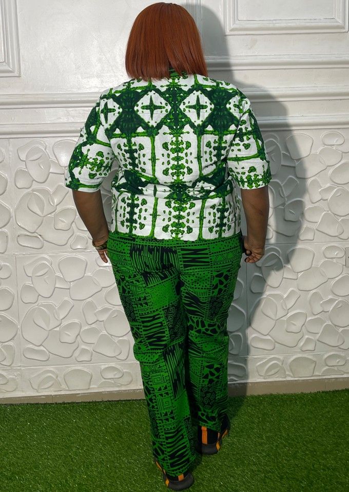"Green African Print Two-Piece Set Make a bold style statement with this elegant Green African Print Two-Piece Set from B&D Clothings. Thoughtfully crafted for women who value comfort, color, and cultural elegance, this outfit blends modern tailoring with timeless African prints. The set features a well-structured top paired with matching trousers, offering a flattering fit suitable for casual outings, work-friendly events, and relaxed social gatherings. The breathable fabric ensures all-day comfort while maintaining a polished, confident look."