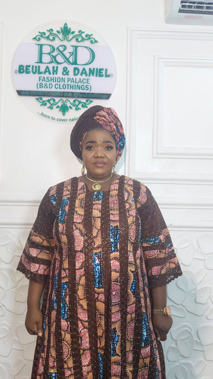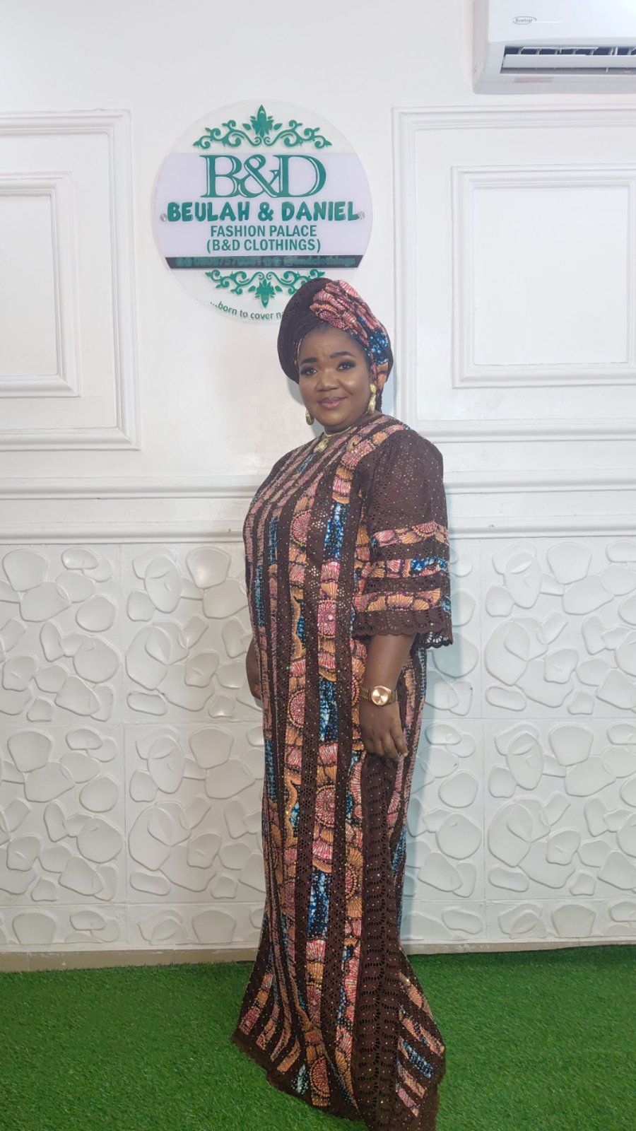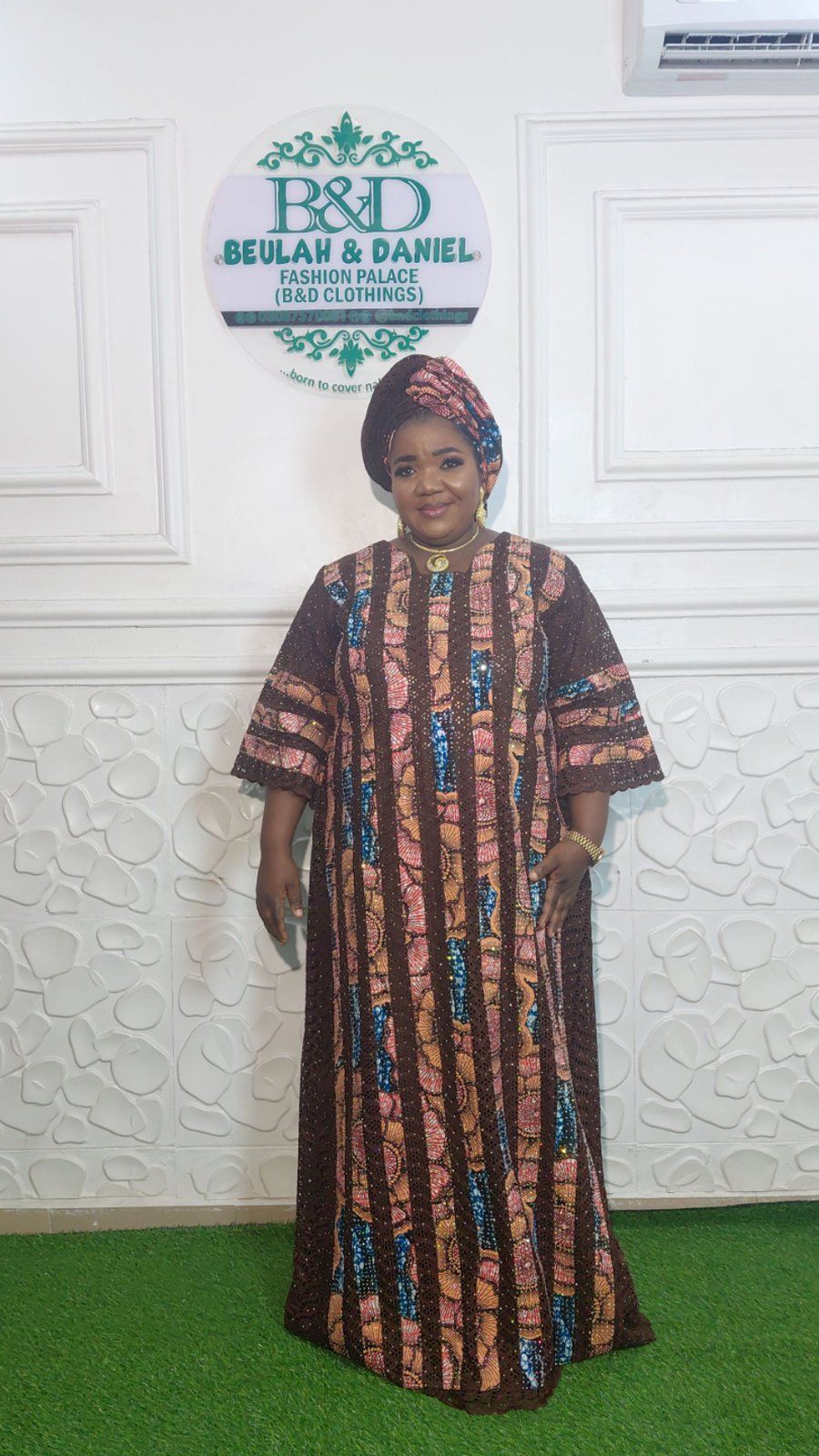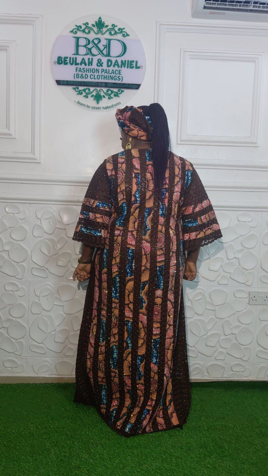 "Step into the room with confidence and grace. This bespoke creation by Beulah & Daniel (B&D Clothings) is a masterclass in texture, blending the classic charm of lace with the bold storytelling of Ankara wax print. Design Highlights Rich Material Palette: Features premium chocolate brown lace intricately combined with multi-colored Ankara panels. Full Rhinestone Embellishment: The entire front of the gown is hand-finished with glistening rhinestones, strategically placed to highlight the Ankara patterns and catch the light beautifully. Vertical Panel Detailing: The long, vertical Ankara strips create a slimming, streamlined silhouette that adds height and elegance to every frame. Artisan Sleeves: Three-quarter length sleeves finished with a scalloped lace hem, offering a modern twist to the traditional Bubu style."